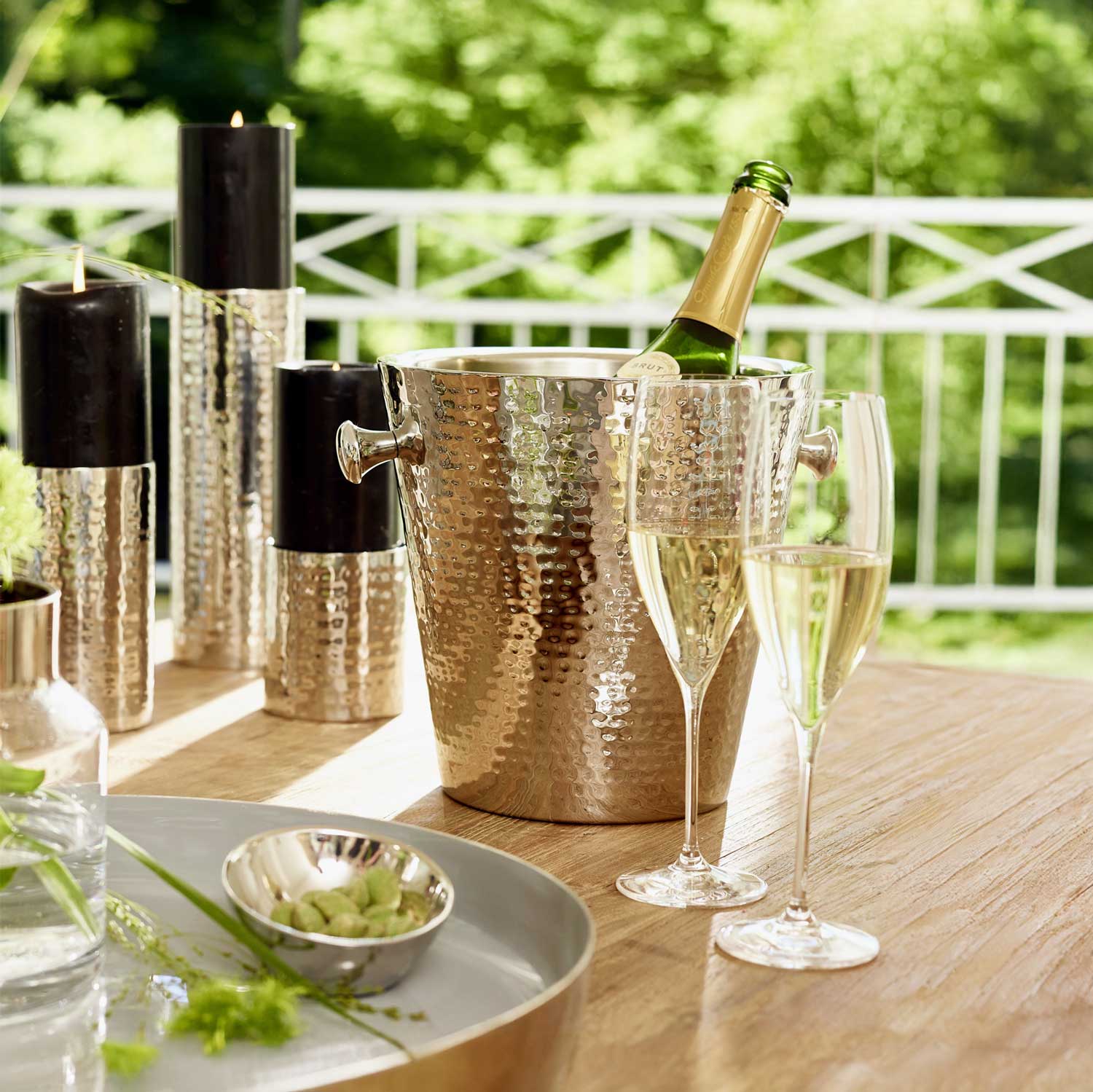 The champagne cooler VALENCIA by EDZARD consists of double-walled stainless steel and is hammered on the outside.