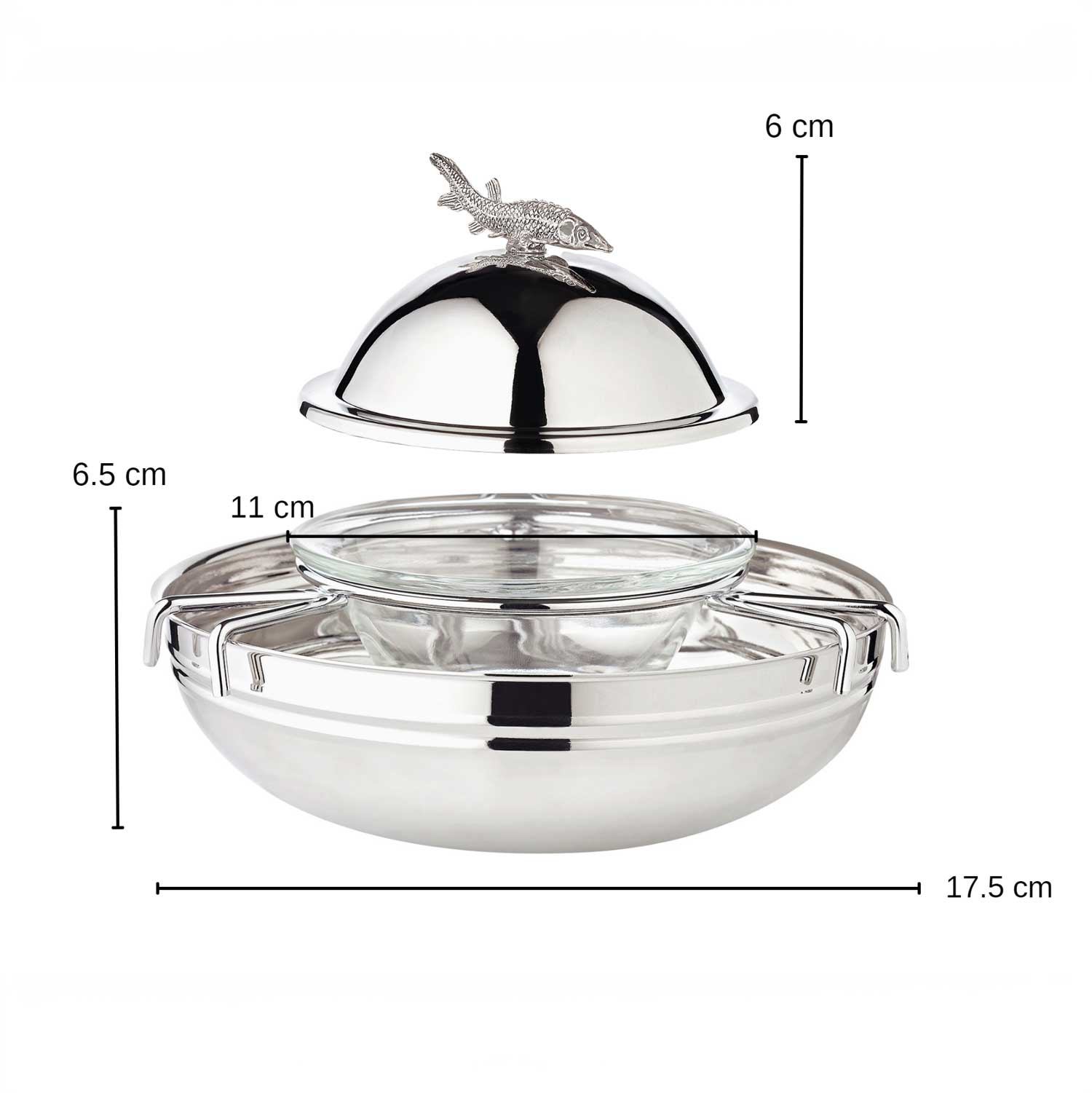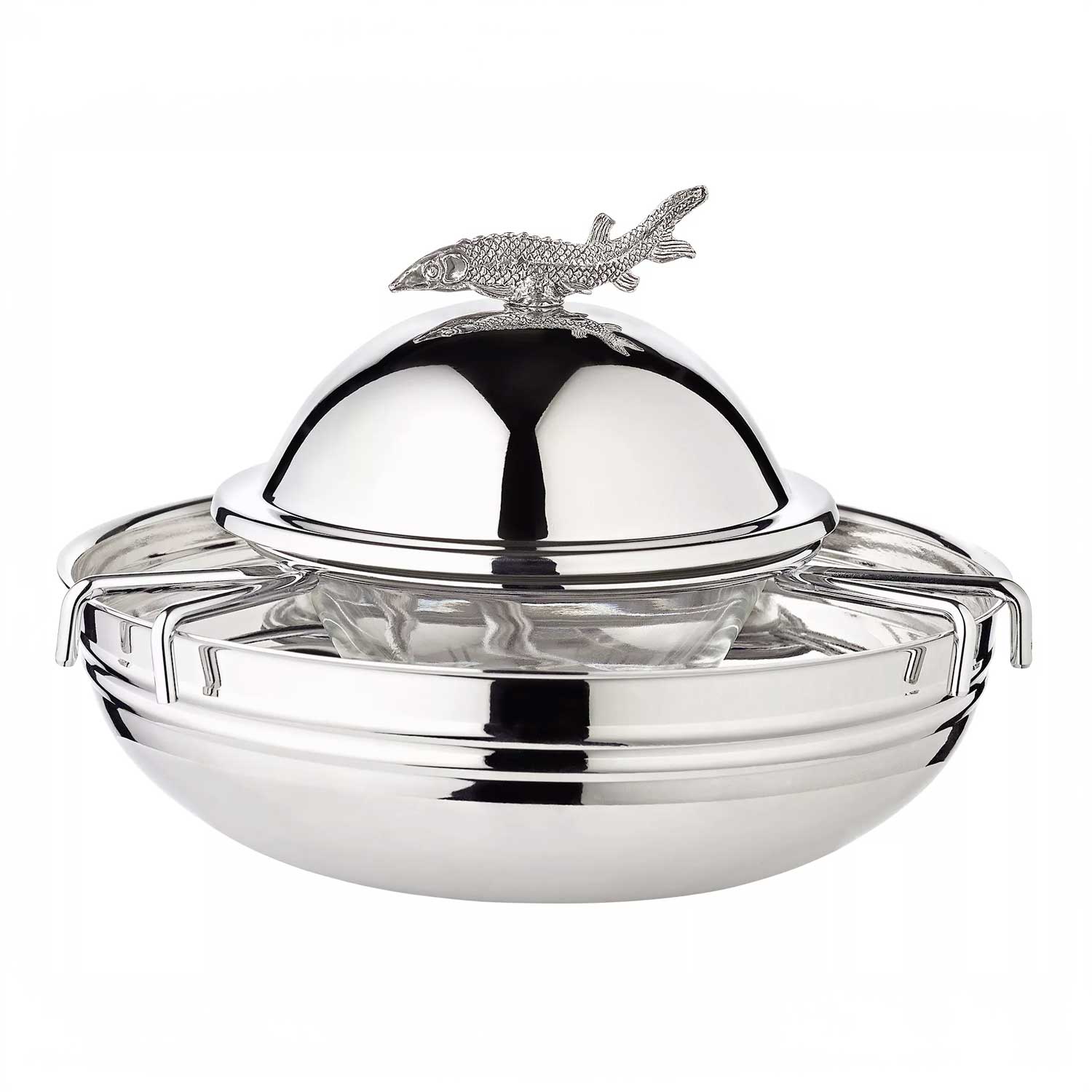 The STURGEON caviar bowl with lid made of stainless steel by Edzard made of highly polished stainless steel is an indispensable utensil for every gourmet. It includes a bowl, holder, glass bowl and a lid decorated with a sturgeon.