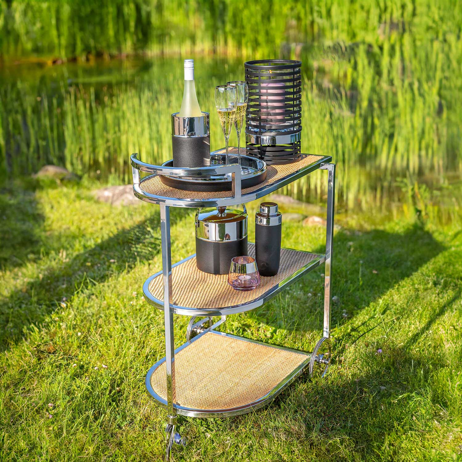 CATANIA bar cart with wickerwork made of stainless steel with natural reed mesh by Fink-Living offers storage space for drinks, snacks or reading and if necessary it can be quickly pushed to the right place. The wheels have a plastic ring that ensures silent rolling. The bar trolley is an elegant home accessory that also creates a contrast outdoors thanks to the combination of natural materials and shiny polished stainless steel.