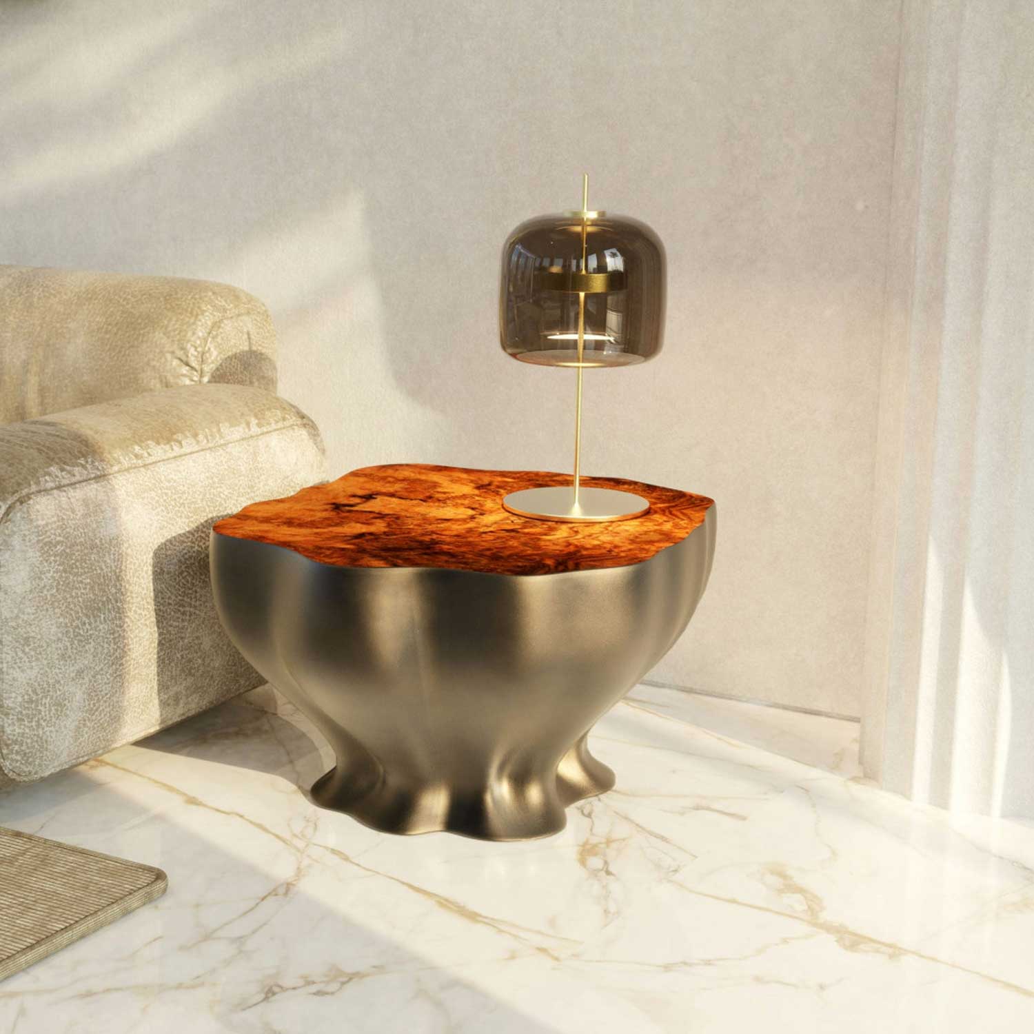 Finished in the exclusive brass color, the base exudes a sense of opulence and sophistication. The walnut root veneer top adds a touch of natural beauty to the table and showcases the wood’s unique patterns and grains.